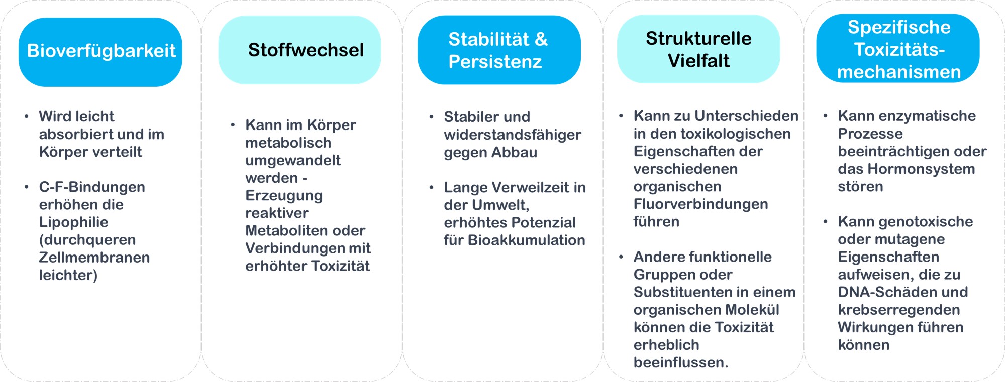 Die C-F Bindung ist eine der stärksten Bindungen in der organischen Chemie (Fluor ist das elektronegativste Element im Periodensystem),. Verbindungen mit C-F-Bindungen zeichnen sich dadurch aus, dass sie sehr widerstandsfähig gegenüber thermischen, chemischen oder biotischen Abbau sind. Diese Beständigkeit bedeutet aber auch, dass sie nahezu unzerstörbar sind. PFAS-Verbindungen reichern sich in den Umweltkompartimenten (Wasser, Boden, Luft), insbesondere im Wasser an und werden nicht auf natürlichem Weg abgebaut.