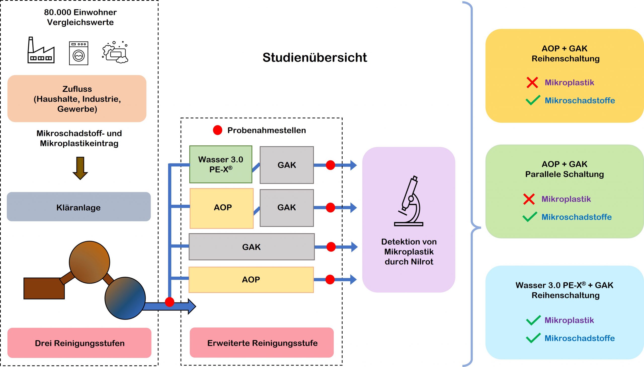Bestehende fortschrittliche (vierte) Behandlungsmethoden wie das fortschrittliche Oxidationsverfahren (AOP) und granulierte Aktivkohle (GAK) entfernen nachweislich wirksam gelöste organische Mikroschadstoffe. Diese Verfahren zielen jedoch nicht auf die Entfernung von Mikroplastik ab, und eine Fähigkeit, Mikroplastik zu entfernen, ist noch nicht hinreichend untersucht.