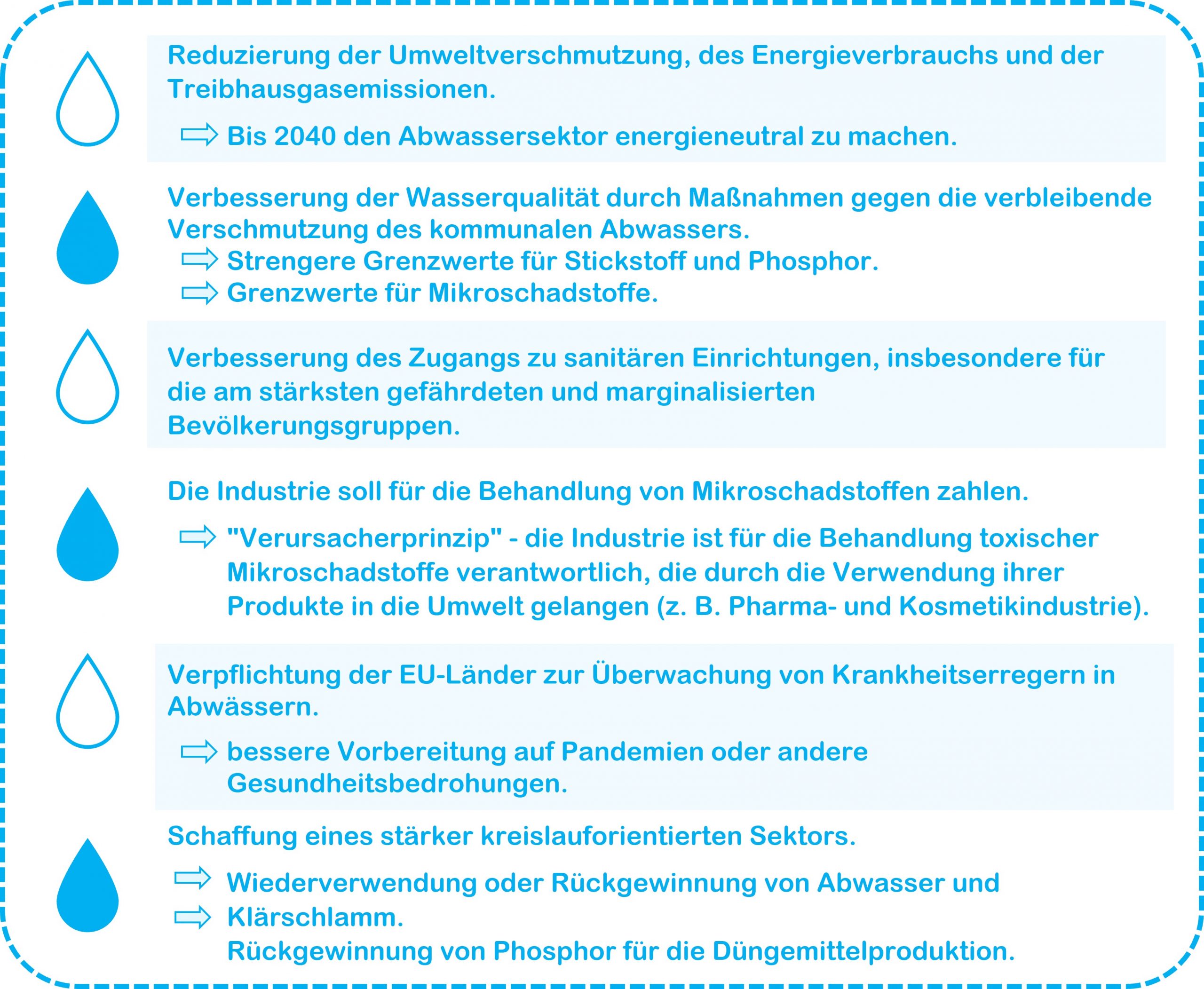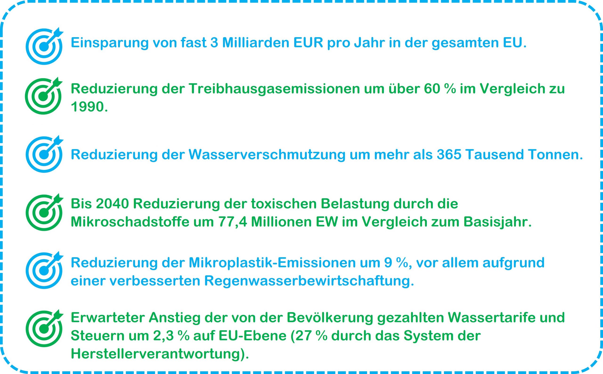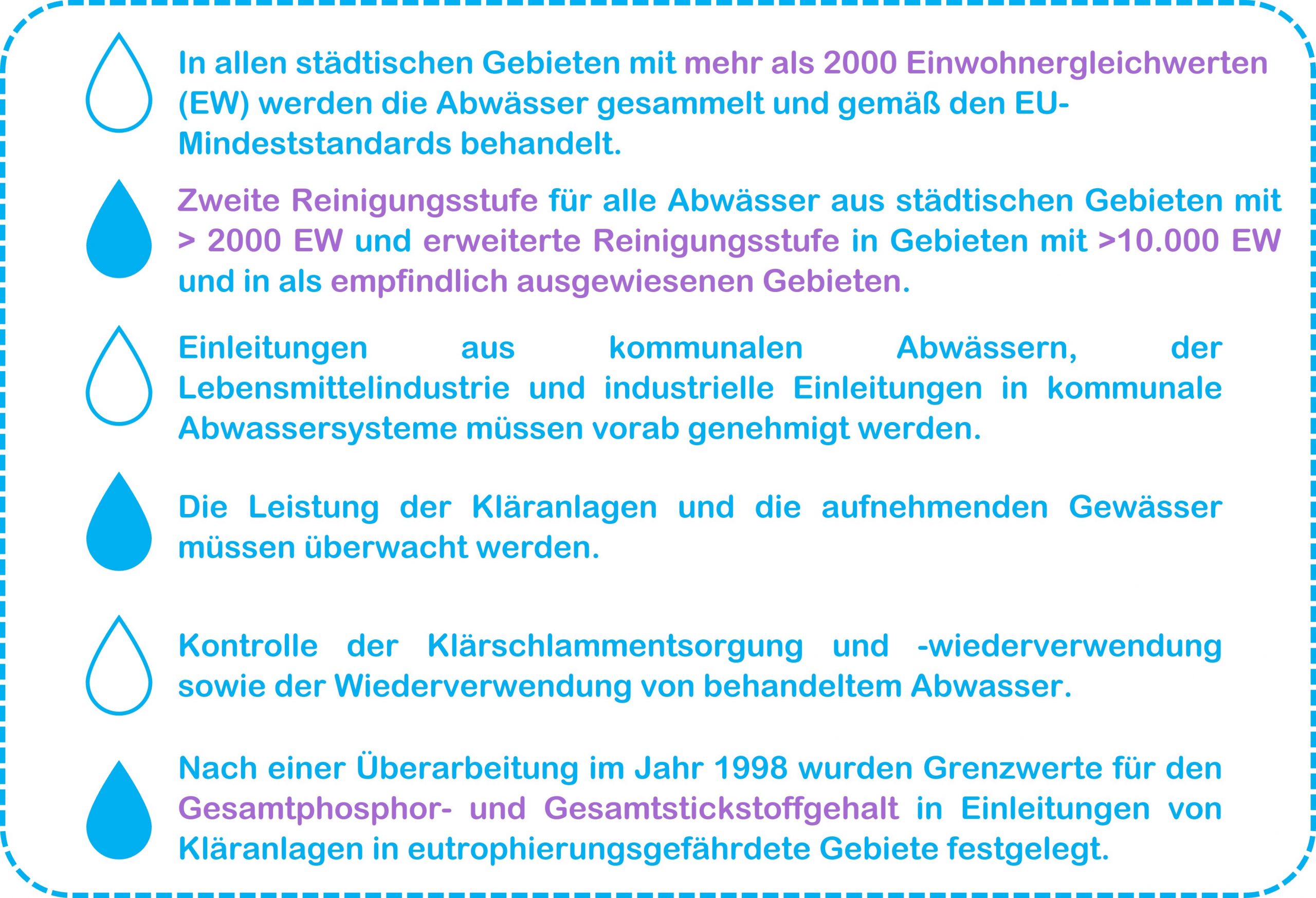 In unserem Blog erhalten Sie einen Überblick über die vorgeschlagenen Änderungen und ihre potenziellen Auswirkungen sowie über die Herausforderungen, die sich stellen, um eine messbare Wirkung zu erzielen. Das große Ziel sind Synergien mit anderen EU-Rechtsvorschriften zu verfolgen und die Anforderungen der Wasserrahmenrichtlinie, der Badegewässerrichtlinie und der Trinkwasserrichtlinie zu erreichen. Und das sind die derzeitigen Anforderungen der EU-Richtlinie an kommunales Abwasser: