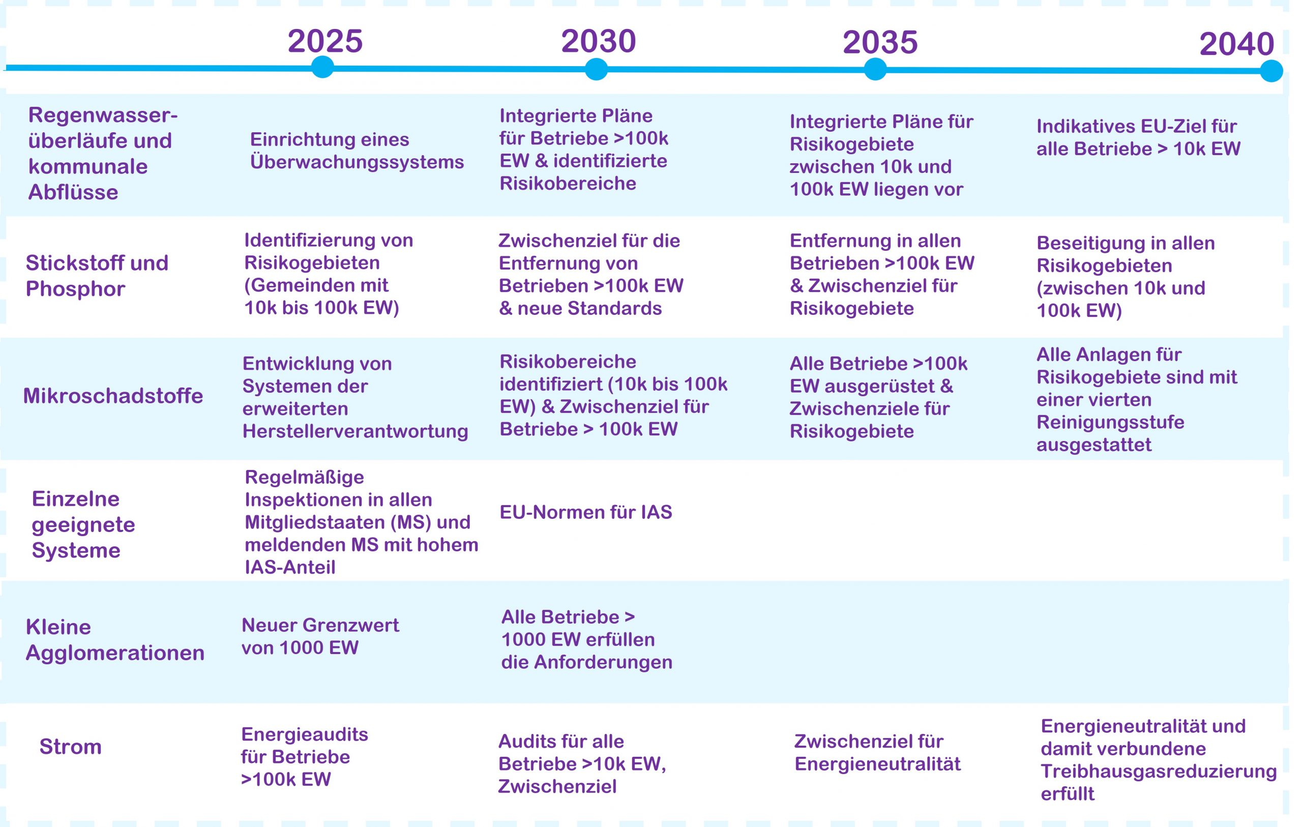 Der Geltungsbereich der bisherigen Richtlinie wird auf alle Städte mit mehr als 1000 Einwohnerwerten (EW) ausgeweitet. Größere Einrichtungen (>100.000 EW) sind verpflichtet, bis 2030 einen lokal integrierten Plan für die Bewirtschaftung von kommunalem Abwasser zu erstellen, um die Verschmutzung durch Regenwasser (städtischer Abfluss und Regenwasserüberlauf) zu bekämpfen, und mittelgroße Einrichtungen (>10.000 EW), bei denen Regenwasser eine Gefahr für die Umwelt oder die menschliche Gesundheit darstellt, müssen bis 2035 einen Plan erstellen.