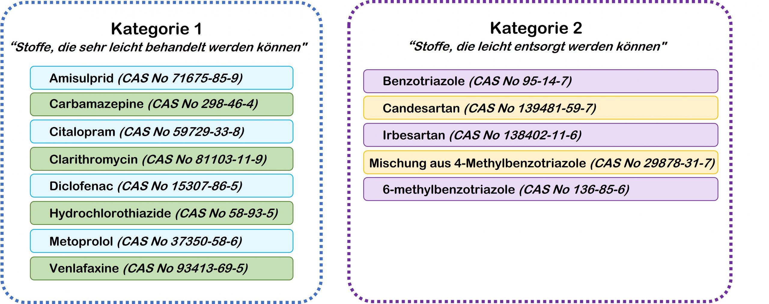 In der überarbeiteten Richtlinie werden insgesamt 13 Mikroschadstoffe als "Stoffe, die das Wasser schon in geringen Konzentrationen verunreinigen können" bezeichnet. Für diese Mikroschadstoffe werden Grenzwerte festgelegt, und für mindestens 6 der Stoffe muss ein Entfernungsgrad von 80 % erreicht werden. Der Durchschnitt der prozentualen Entfernung aller Stoffe, die in die Berechnung einfließen, wird herangezogen um festzustellen, ob eine 80 % Entfernung erreicht wurde.