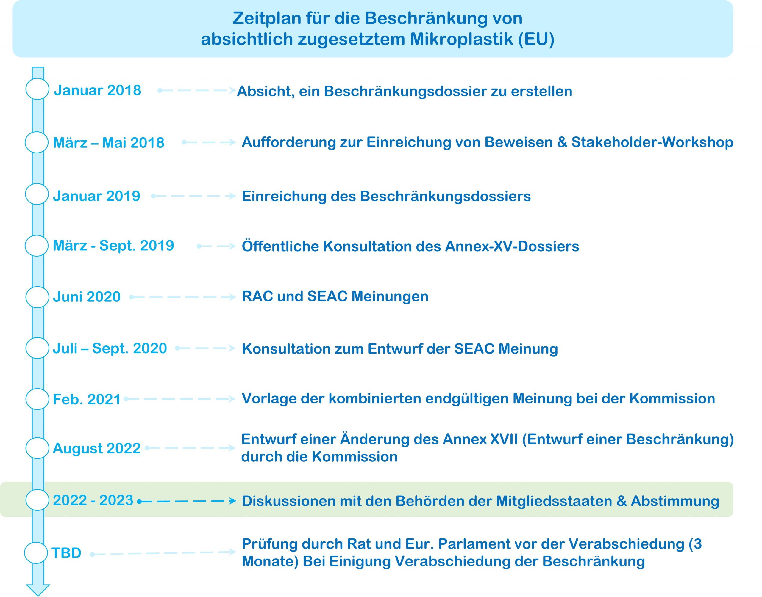 Der Vorschlag für die Beschränkung von Mikroplastik wurde 2020 vom ECHA’s „Committee for risk assessment“ (RAC) und vom ECHA’s „Commitee for socio-economic analysis“ (SEAC) geprüft und der Entwurf entsprechend aktualisiert; ein endgültiger Änderungsentwurf (Annex XVII) wurde am 30. August 2022 veröffentlicht. Diskussionen und eine Abstimmung über die vorgeschlagenen Beschränkungen werden zwischen den Behörden der Mitgliedstaaten im Zeitraum von 2022-2023 stattfinden.