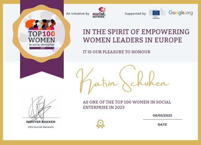 16. März 2023Dr. Katrin Schuhen ist unter den TOP 100 Women Leaders in Social Enterprises 2023