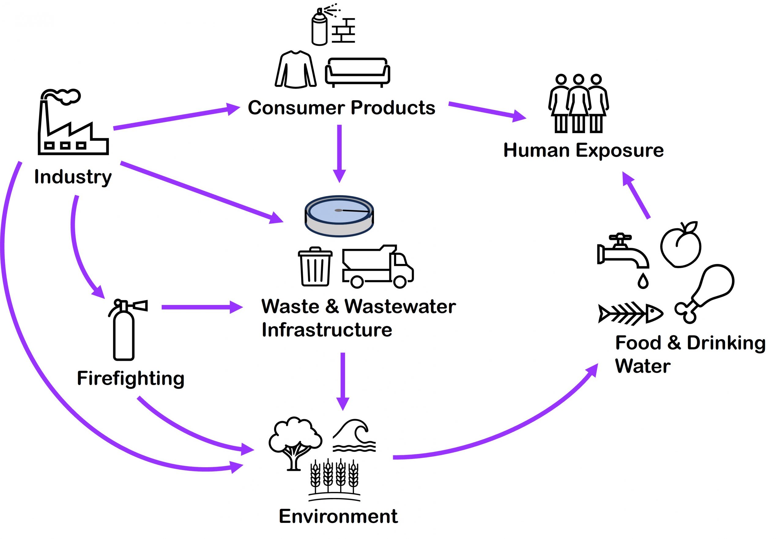 - Industrial and municipal wastewater treatment plants -> originate from upstream sources such as industries, household products, human waste; available treatment options (including advanced treatment) do not destroy PFAS