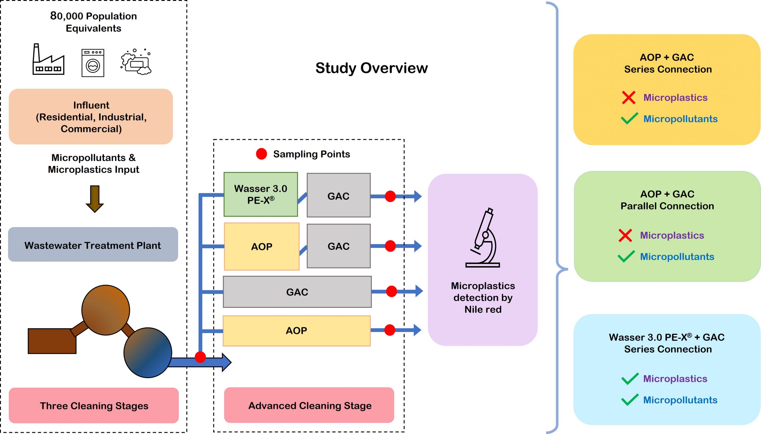 Measuring the microplastic removal efficiencies for the AOP and GAC units connected in series and in parallel showed that the combination of AOP + GAC had no significant effect on the microplastics removal. This confirmed the need for an adaptation of the fourth cleaning steps to target microplastic removal in addition to micropollutants.