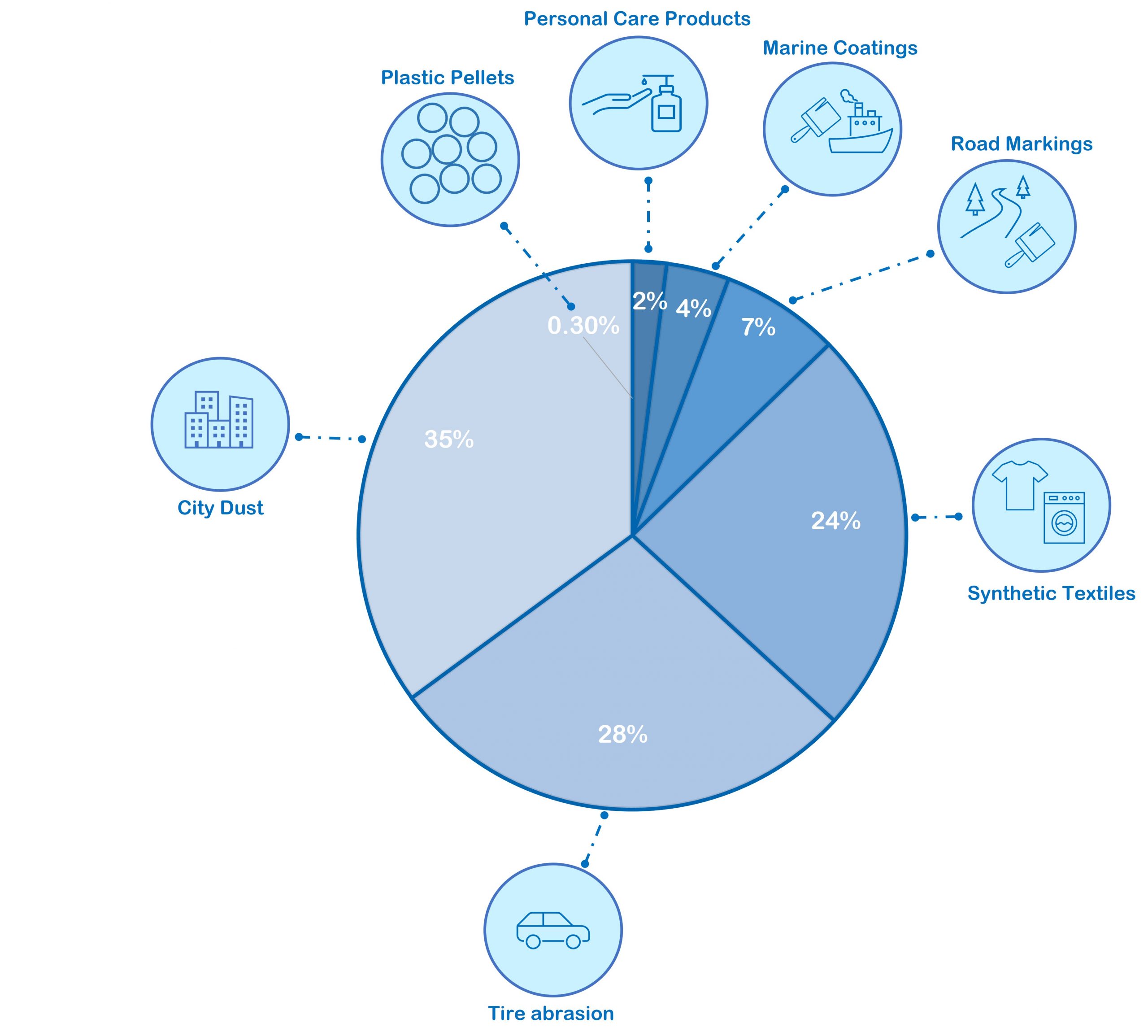 Microplastics are synthetic polymers < 5 mm often containing functional additives. They are divided into two main categories: 1. Primary microplastics (directly released into the environment) and 2. Secondary microplastics (formed from the degradation of larger plastic particles).