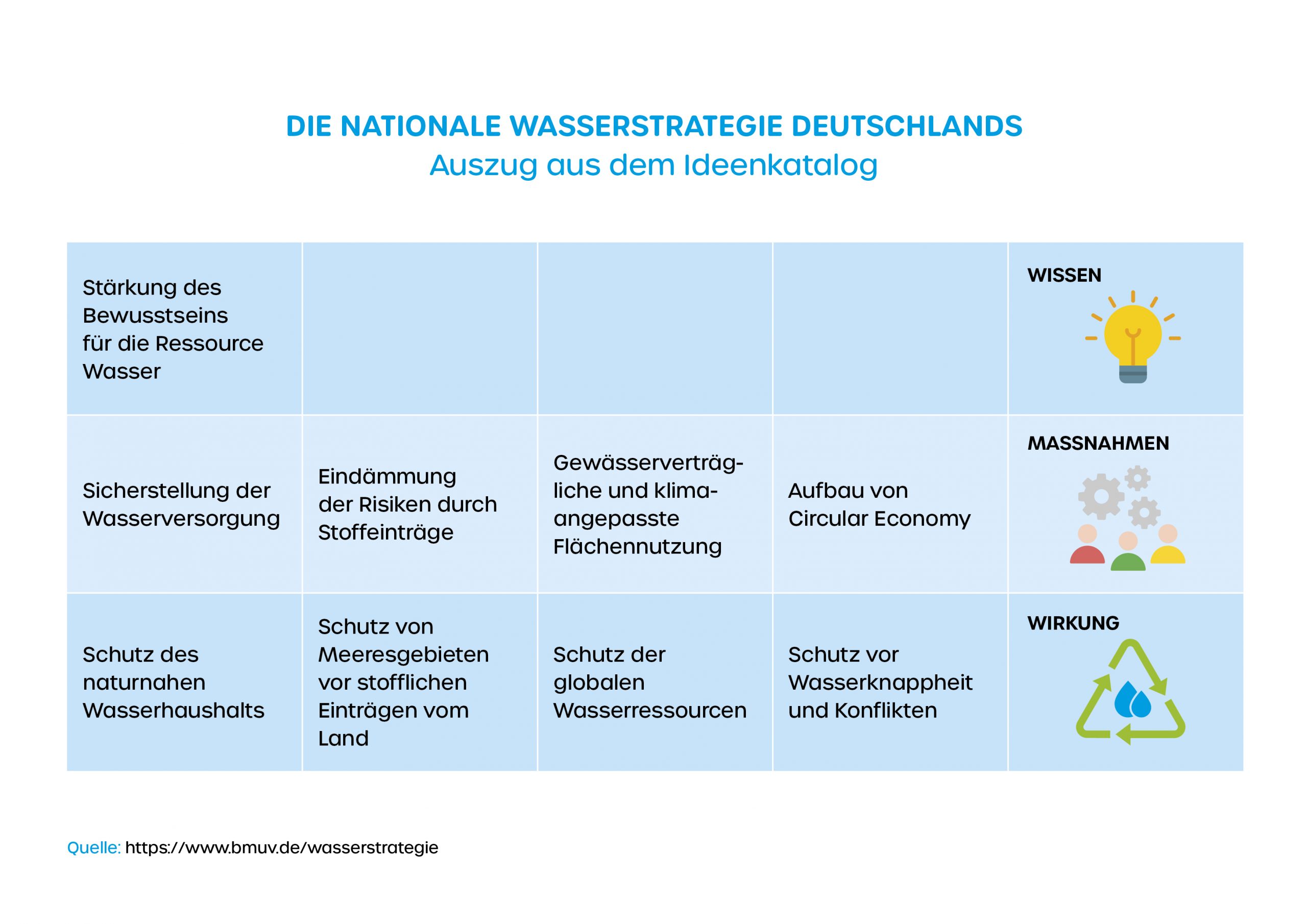 Hierbei bildet die Nationale Wasserstrategie ein wichtiges Instrument. Sie ist in Deutschland ein wichtiger Rahmen, um den nachhaltigen Umgang mit Wasser zu sichern. Sie wurde entwickelt, um die Wasserressourcen zu schützen, die Wasserqualität zu verbessern und die Wasserversorgung für die Zukunft zu gewährleisten. In der Strategie werden Ziele gesetzt, wie zum Beispiel:
